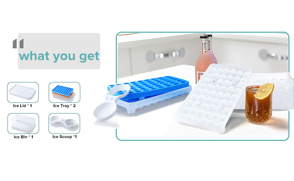 - đ§ăEasy ReleaseăThe round ice cube tray with lid and bin is made of extremely flexible PP, which can easily release perfectly Sphere ice cubes compared to silicone molds. Just turn the frozen ice tray upside down and twist the mini ice cube tray to get the perfect 50x2 mini circle ice balls!